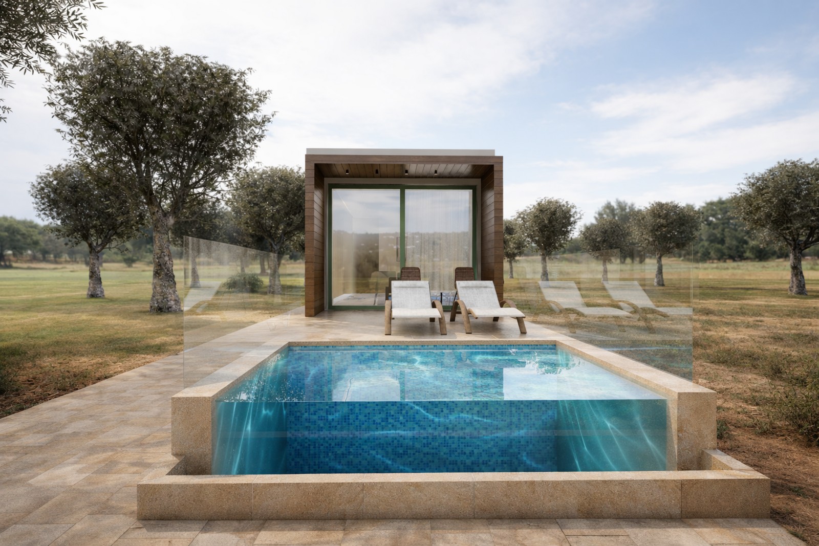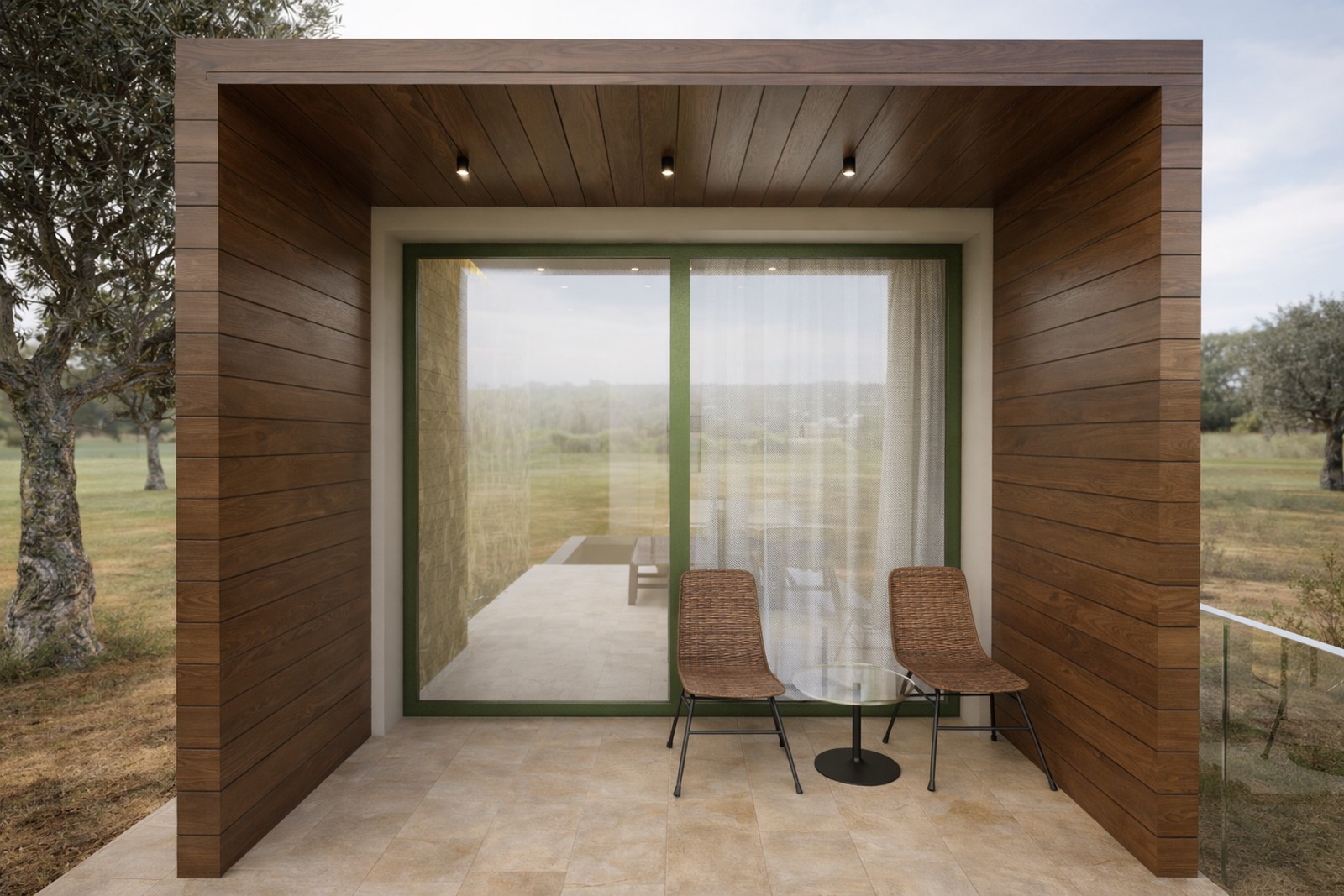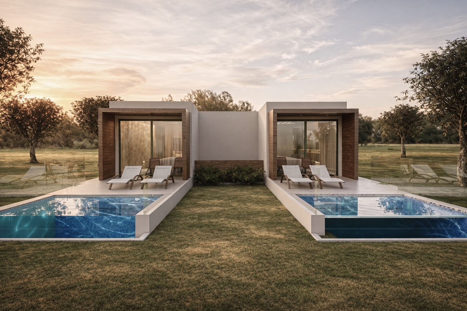 Η μονάδα μπορεί να συνοδευτεί από διαμορφωμένο εξωτερικό χώρο – ιδιωτική αυλή – ενώ παρέχεται η δυνατότητα προσθήκης πισίνας υπερχείλισης, αναβαθμίζοντας περαιτέρω την εμπειρία διαμονής και δημιουργώντας ένα ολοκληρωμένο περιβάλλον υψηλής αισθητικής.